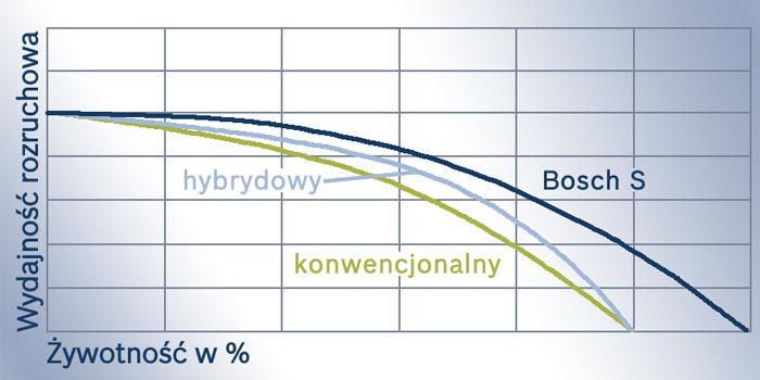 Porównanie parametrów konwencjonalnych akumulatorów antymonowych, akumulatorów hybrydowych oraz akumulatorów Bosch S. Widoczna jest o 20% dłuższa żywotność akumulatorów wykorzystujących technologię PowerFrame oraz ich wyższa wydajność rozruchowa przez cały okres użytkowania.