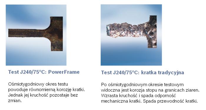 Na zdjęciu widzimy fragmenty kratek, wykonanej w technologii PowerFrame i tradycyjnej, po ośmiu tygodniach testu J240/75 (stosowanego przez producentów samochodów w USA podczas wyboru akumulatora na montaż fabryczny). Jak widać po zakończeniu testu kratka PowerFrame praktycznie utrzymuje swoją strukturę, a przez to parametry użytkowe (niską rezystancję oraz wysoką przewodność), natomiast kratka tradycyjna ulega korozji na krawędziach ziaren (wypłukiwane są zanieczyszczenia gromadzące się wokół ziaren) przez co wzrasta jej kruchość i opór wewnętrzny, natomiast spada zdolność do przewodzenia prądu.