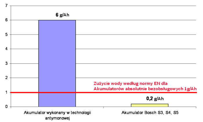 Zużycie wody przez akumulator Bosch S wykonany w technologii PowerFrame jest 30-krotnie mniejsze niż w przypadku akumulatora tradycyjnego i 5-krotnie mniejsze niż zaklada to norma EN dla akumulatorów absolutnie bezobsługowych.