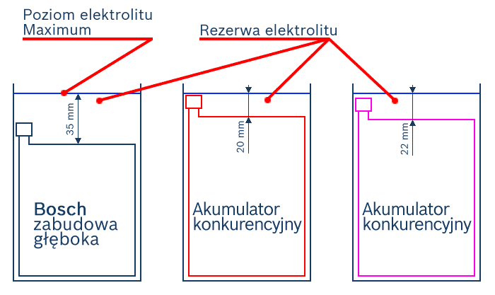 Zwiększona rezerwa elektrolitu pozwala na wydłużenie czasu użytkowania akumulatora Bosch S nawet o ponad 20% w porównaniu z akumulatorami tradycyjnymi.
