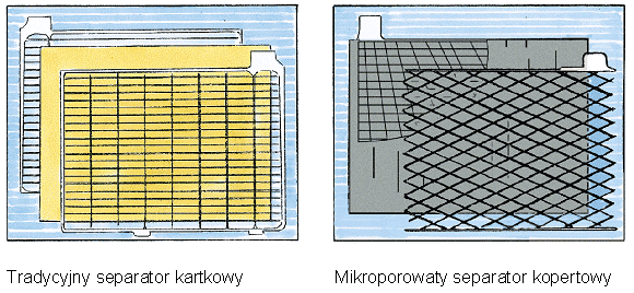 W akumulatorze tradycyjnym płyty w zestawach dodatnich i ujemnych są pooddzielane od siebie separatorami i umieszczone w poszczególnych celach. Separatory przypominające powkładane między płyty kartki mają za zadanie zabezpieczenie płyt przed zetknięciem ze sobą i zwarciem. Nie zabezpieczają one jednak przed zwarciem w wyniku utworzenia przez masę czynną „mostka” pod płytami.